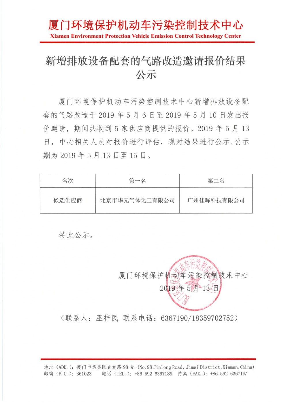 新增排放設(shè)備配套的氣路改造邀請(qǐng)報(bào)價(jià)結(jié)果公示 欄目:通知公告 來源:廈門科技產(chǎn)業(yè)化集團(tuán) 時(shí)間:2019-05-13 熱度:420