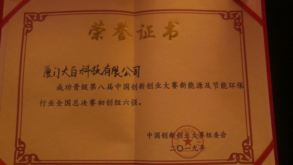 2019年11月25-28日,第八屆中國(guó)創(chuàng)新創(chuàng)業(yè)大賽新能源及節(jié)能環(huán)保行業(yè)總決賽在宜春舉行。經(jīng)過激烈角逐,最終廈門賽區(qū)的廈門大白科技有限公司獲得本次總決賽的初創(chuàng)企業(yè)組六強(qiáng)、優(yōu)秀獎(jiǎng)。此外,廈門兌泰實(shí)業(yè)科技有限公司獲得本屆中國(guó)創(chuàng)新創(chuàng)業(yè)大賽新能源及節(jié)能環(huán)保行業(yè)總決賽優(yōu)秀獎(jiǎng)。
