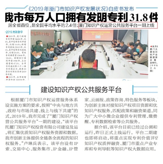 2020年4月20日由廈門市市場監(jiān)督管理局召開新聞發(fā)布會,宣布平臺(一期)正式上線;平臺是根據(jù)廈門市知識產權運營服務體系建設實施方案的要求,在廈門市市場監(jiān)督管理局(知識產權局)指導下設立的公共服務平臺。平臺匯集優(yōu)質知識產權服務資源和數(shù)據(jù),通過線上平臺和線下園區(qū)服務中心構建便民利民的知識產權公共服務體系,為我市創(chuàng)新主體提供全鏈條全流程的知識產權服務。