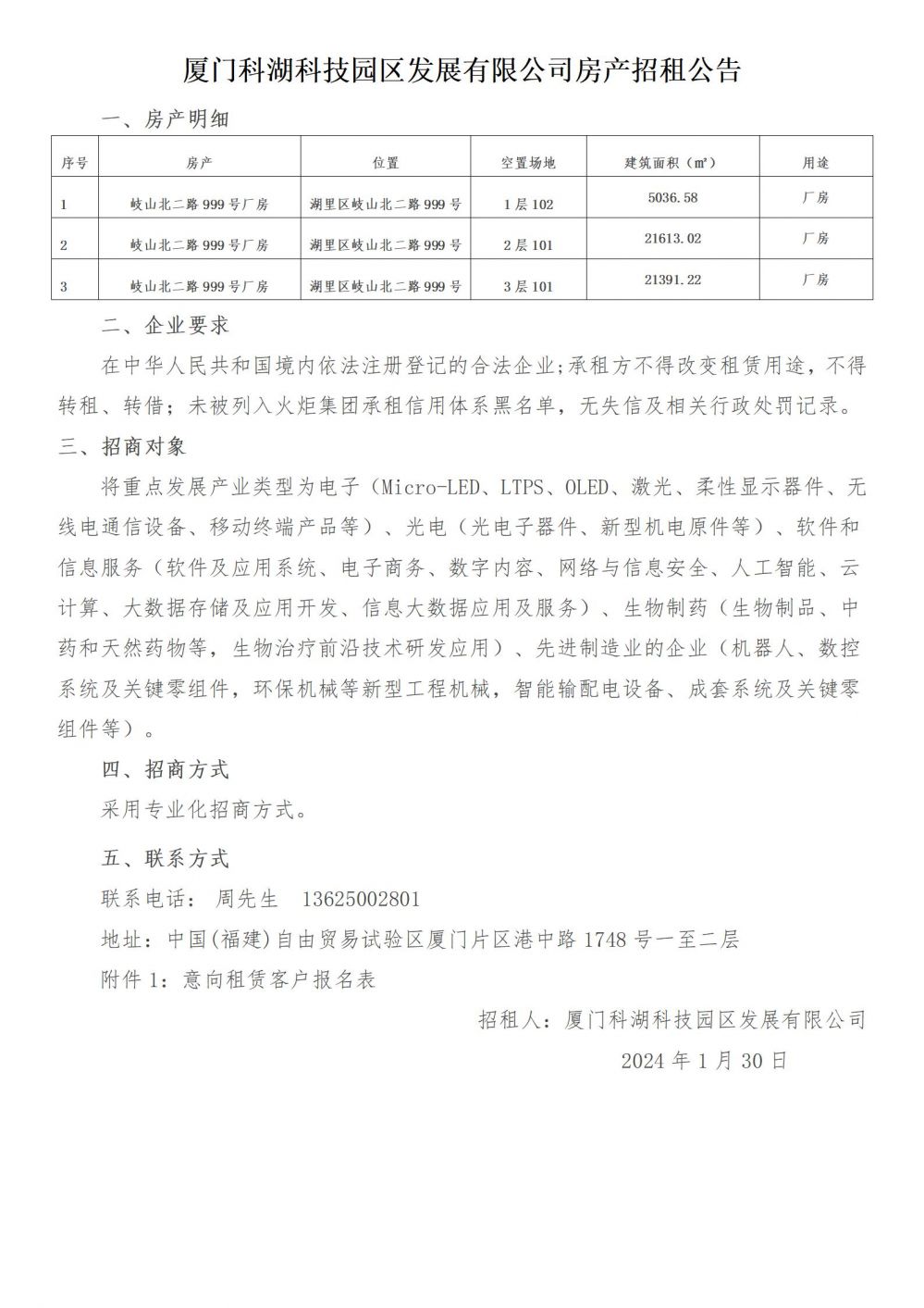 廈門科湖科技園區(qū)發(fā)展有限公司房產招租公告