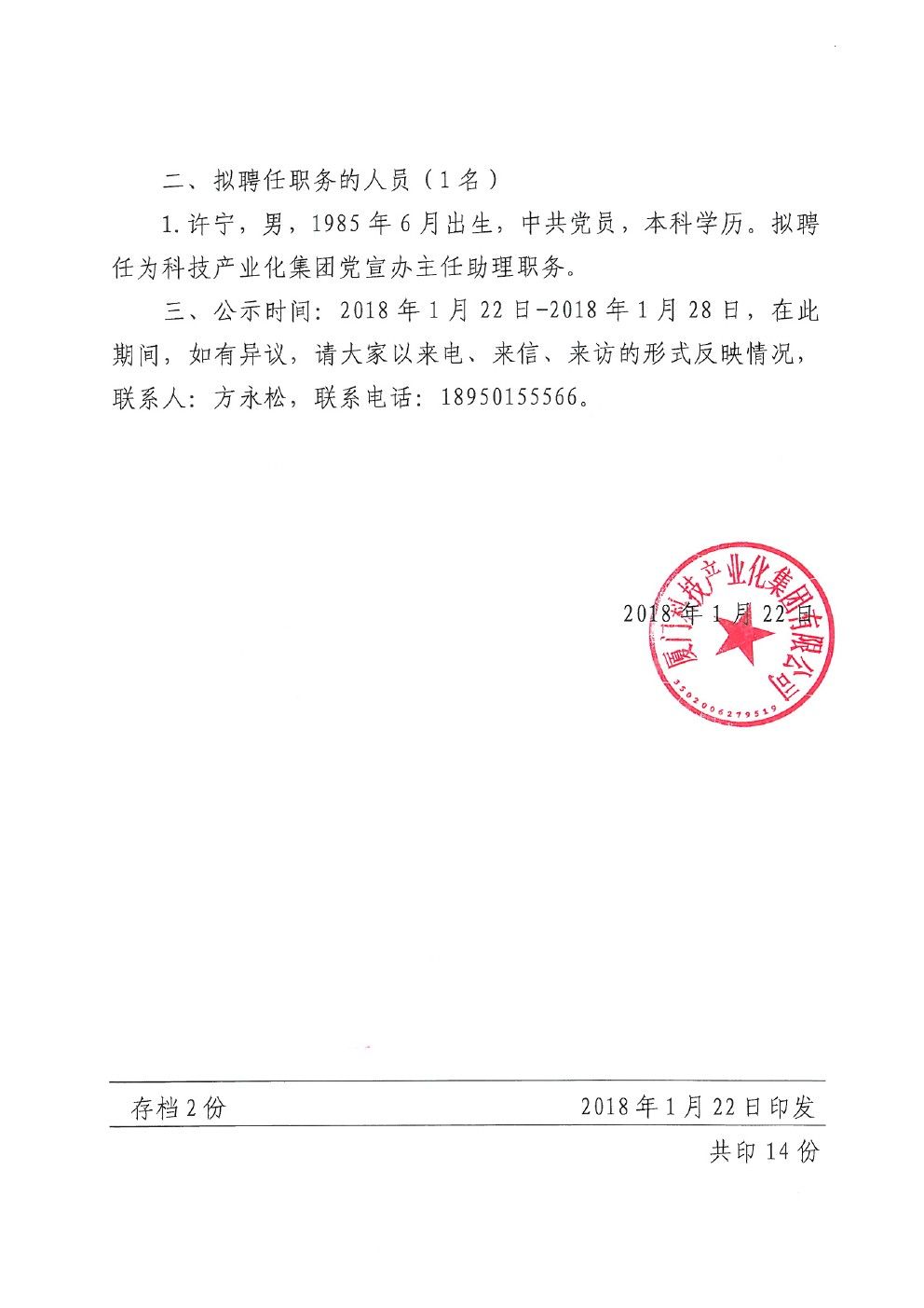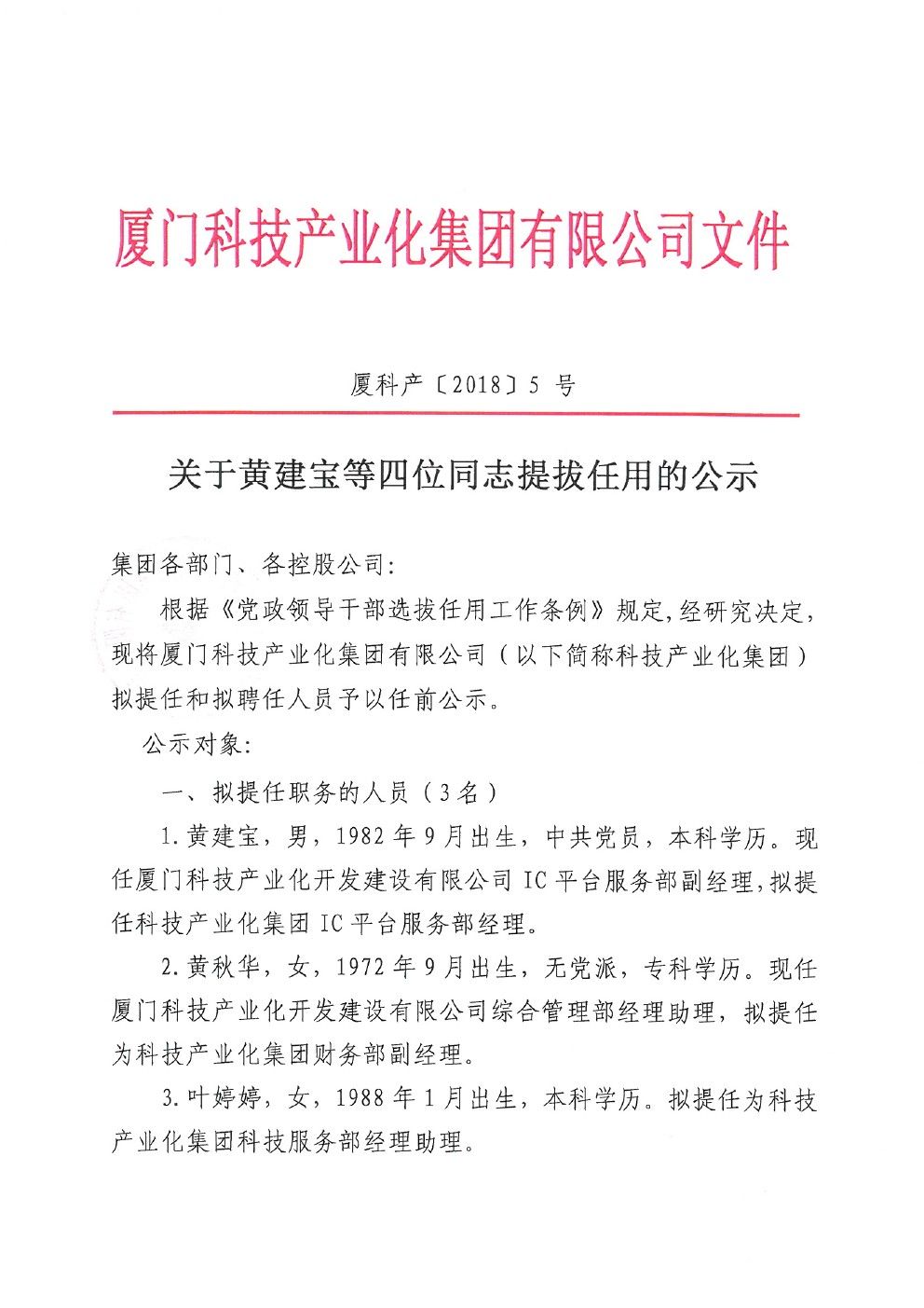 關(guān)于黃建寶等四位同志提拔任用的公示 欄目:通知公告 來源:廈門科技產(chǎn)業(yè)化集團 時間:2018-01-25 熱度:287 關(guān)于黃建寶等四位同志提拔任用的公示.pdf
